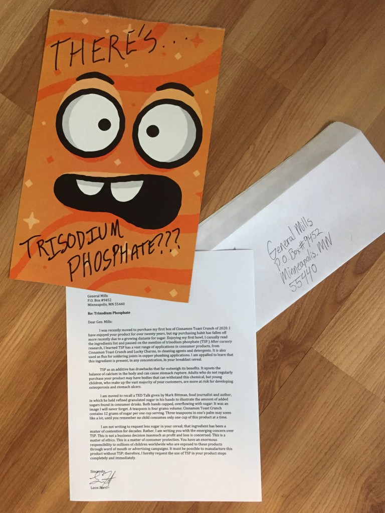 I was recently moved to purchase my first box of Cinnamon Toast Crunch of 2020. I have enjoyed your product for over twenty years, but my purchasing habit has fallen off more recently due to a growing distaste for sugar. Enjoying my first bowl, I casually read the ingredients list and paused on the mention of trisodium phosphate (TSP.) After cursory research, I learned TSP has a vast range of applications in consumer products, from Cinnamon Toast Crunch and Lucky Charms, to cleaning agents and detergents. It is also used as flux for soldering joints in copper plumbing applications. I am appalled to learn that this ingredient is present, in any concentration, in your breakfast cereal.