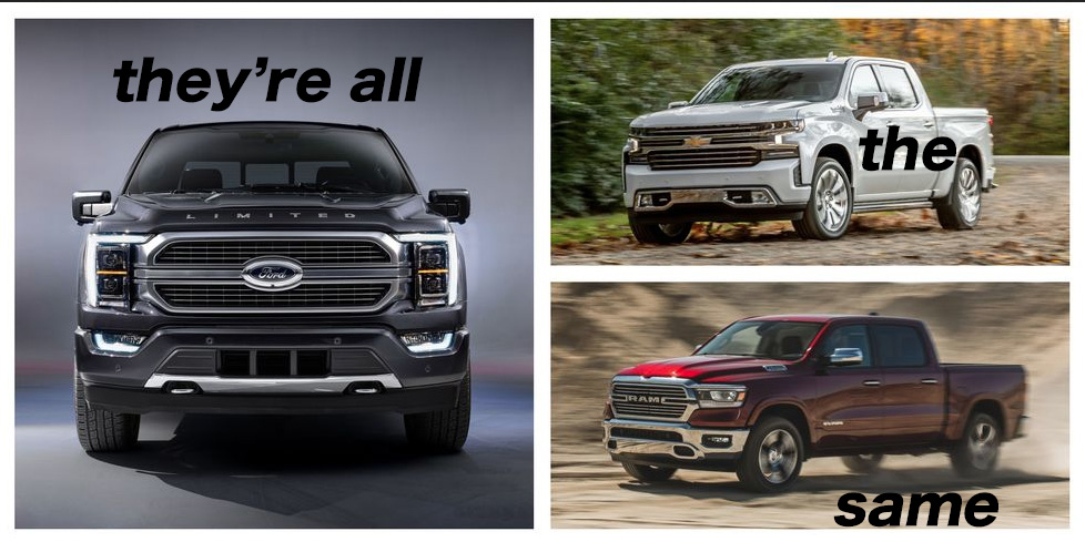 Ford, Chevy, Toyota, whatever – What’s the difference? A half-ton, 4WD, 8′ box – I’d prefer a regular cab, just so I could maintain some image of utility over posturing – Trucks are trucks, for better or for worse – It would be nice to have something brand new, but if I could have a 2022 anything, it would probably be a truck.
